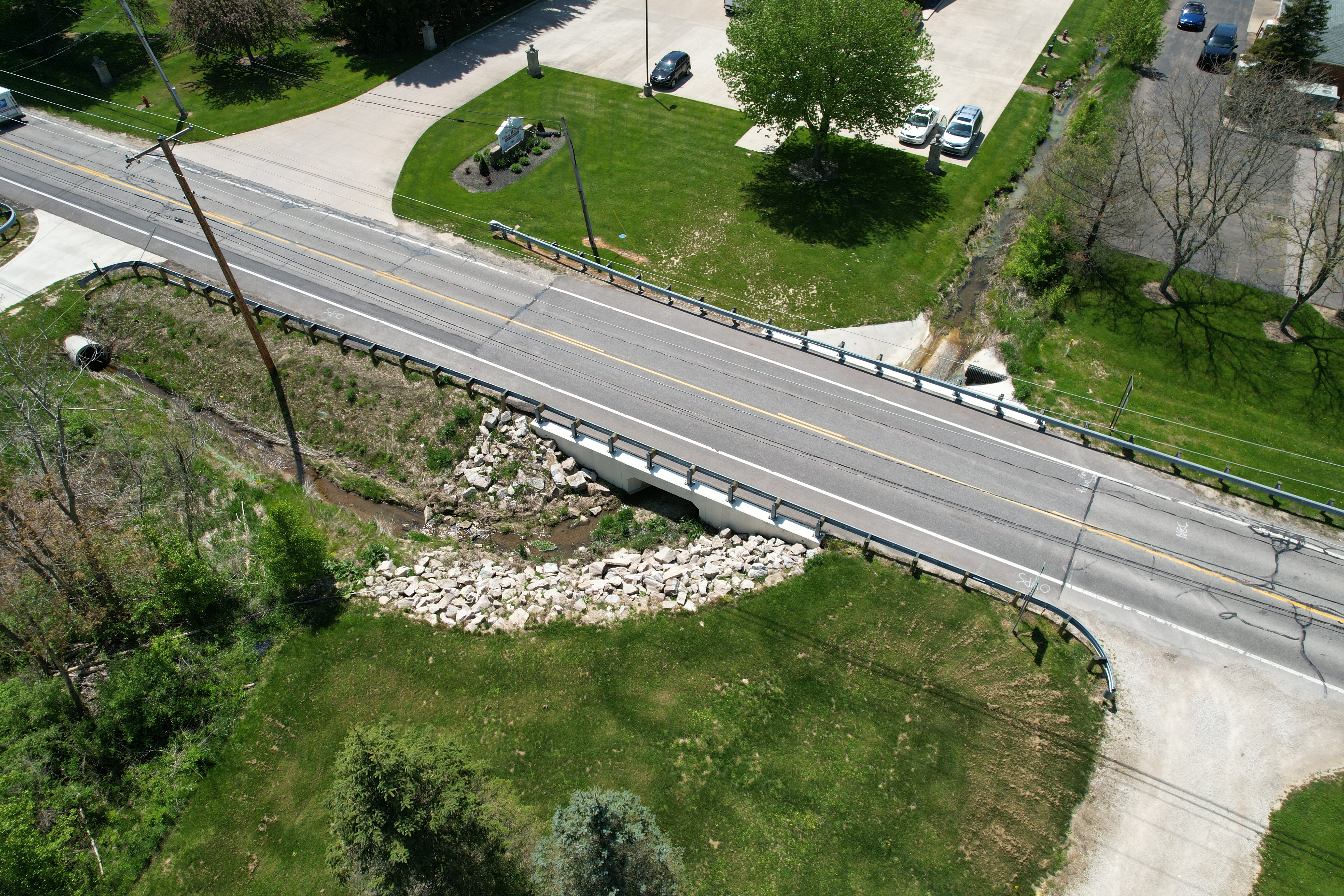 Euthenics completed the engineering and surveying for the replacement of the existing single-span slab bridge with a 4-sided 10' x 5' reinforced concrete box culvert, with reinforced concrete headwalls, reinforced concrete turnback wingwall with the invert buried 1 foot below the flowline. The project included full-depth pavement replacement and new storm sewer conduit. SR 94 was closed to thru-traffic during construction.