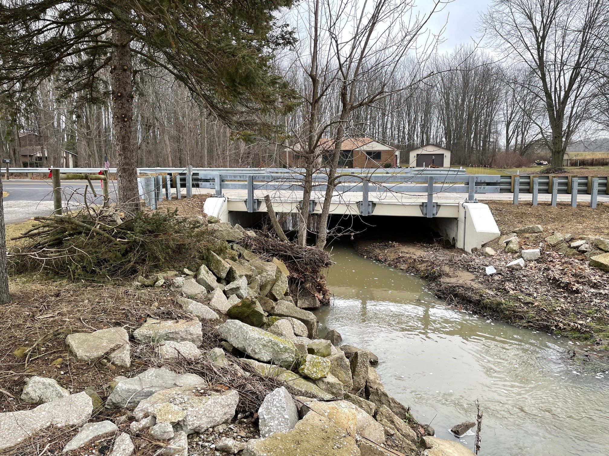 Euthenics developed simplified plans for the rehabilitation of the Oberlin Road Battenhouse Ditch Crossing as part of a general engineering services agreement with the Lorain County Engineer. The existing non-composite concrete box beam superstructure was replaced with a cast-in-place reinforced concrete slab to satisfy the County's desire for a superstructure with less depth. Survey included locating the road’s centerline and property pins and the topographic survey with basemapping. The project was funded through federal and state sources and required a complete road closure and detour during construction.